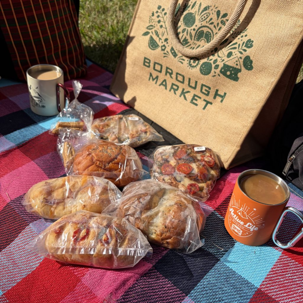 ピクニック用のシートを広げて、パンを頂きます。